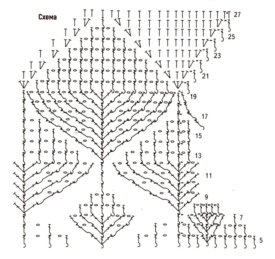 Далее вяжите узор с 5-го по 27-й ряд по схеме (в 5-м ряду провязывайте лиц. рельефные ст. с/н над лиц. рельефными ст. с/н, пропуская возд. п.].