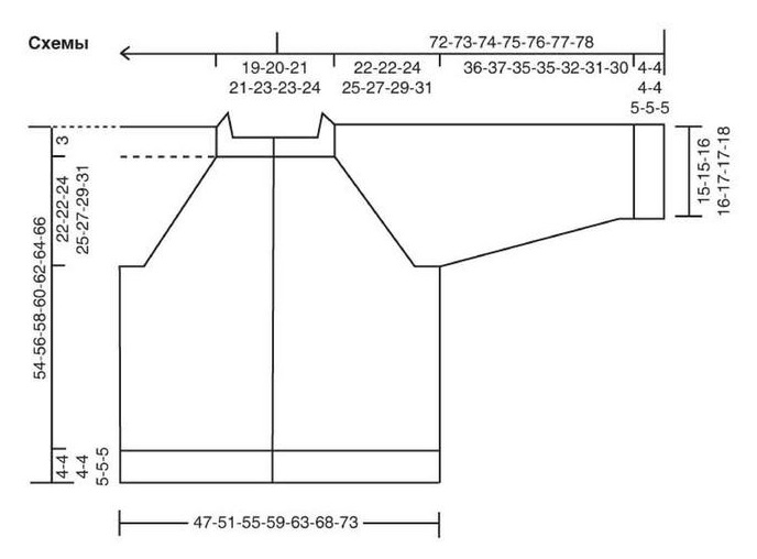Выполнить 1-й и 2-й р. 5-5-7-8-6-6-7 раз (10-10-14-16-12-12-14 провязанных рядов). Регланные прибавки были выполнены в высоту в общей сложности 27-27-29-30-30-30-31 раз (по 72-72-76-78-80-80-82 п. для каждого рукава, по 60-60-62-63-65-65-66 п. для каждой полочки и 87-89-93-97-99-101-105 п. для спинки) 351-353-369-379-389-391-401 п.