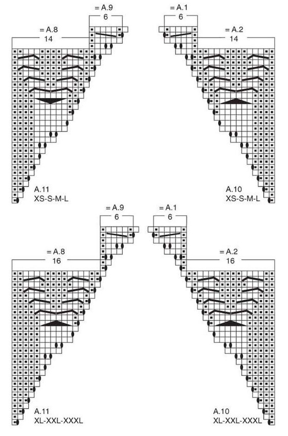 1st r. (= лиц. ряд): 7 п.планки, вязать узорами А.1. A.2, A.1, A.2. А. 1. А.7, 2 лиц.. вязать узором А.5, 16-16-16-16-18-18-18 п. узором А.6, как раньше, вязать узорами А.9. Α.2. A.1, 16-16-16-16-18-18-18 п. узором А.6, вязать узором А. 7. 2 лиц., вязать узором Α.5, 73-75-75-77-83-85-87 п. узором А.6, вязать узором А.7. 2 лиц., вязать узором А.5. 16-16-16-16-18-18-18 узором А.6, вязать узорами А.9. А.В. A.1, 16-16-16-16-18-18-18 п. узором А.6, вязать узором А.7, 2 лиц., вязать узорами A.5, Α.9, Α.8, Α.9, Α.8, Α.9, 7 п. планки.