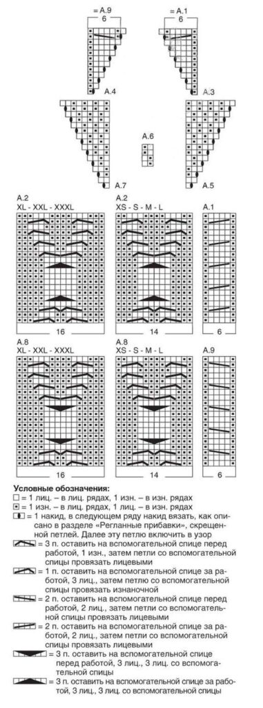 Далее вязать узорами (см. «Узоры») и при этом одновременно с обеих сторон от 2 регланных петель в каждом лицевом ряду выполнять прибавки, прибавки обозначены на схеме, вязать их, как описано выше