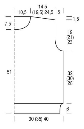Для пройм через 32 см = 94 р. (30 см = 88 р.) 28 см = 82 р. от планки с обеих сторон закрыть 1 раз по 4 п. и в каждом 2-м р. 1 раз по 3 п. и 1 раз по 2 п. = 93 (111) 129 п.