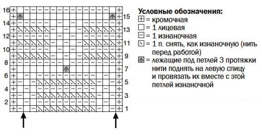 . Количество петель кратно 14 + 1 + 2 кромочные. Вязать по схеме. На ней приведены все ряды. Начать с петли перед правой стрелкой, повторять раппорт между стрелками и закончить петлями после левой стрелки. Повторять 1-16-й ряды.