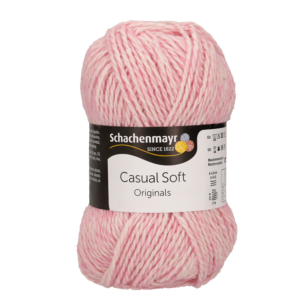 Для вязания нам потребуется 450 (500) 550 г розовой меланжевой (цвет № 00035) пряжи SCHACHENMAYR “Casual Soft”: (73% хлопок, 19% шерсть, 8% вискоза; 100 м/50 г.
