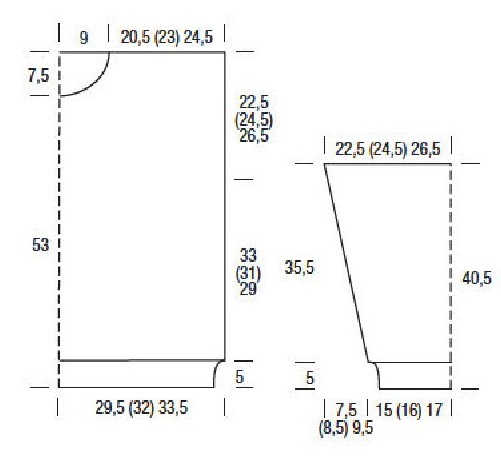 вязать, как спинку, но с вырезом горловины. Для этого через 48 см = 144 р. от планки закрыть средние 14 п. и обе стороны за кончить раздельно. Для закругления выреза с внутреннего края в каждом 2-м р. закрыть 2 раза по 3 п., 1 раз 2 п. и 3 раза по 1 п.