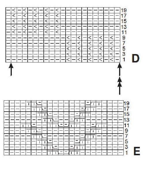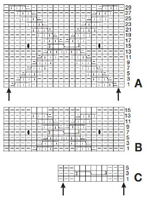 На ней приведены только лицевые ряды; в изнаночных рядах петли вязать по рисунку, скрещенные петли вязать изнаночными скрещенными. Повторять раппорт между стрелками, закончить петлей после левой стрелки. С 1-го по 20-й ряд вязать 1 раз, затем с 1-го по 10-й ряд вязать еще 1 раз = 30 р.