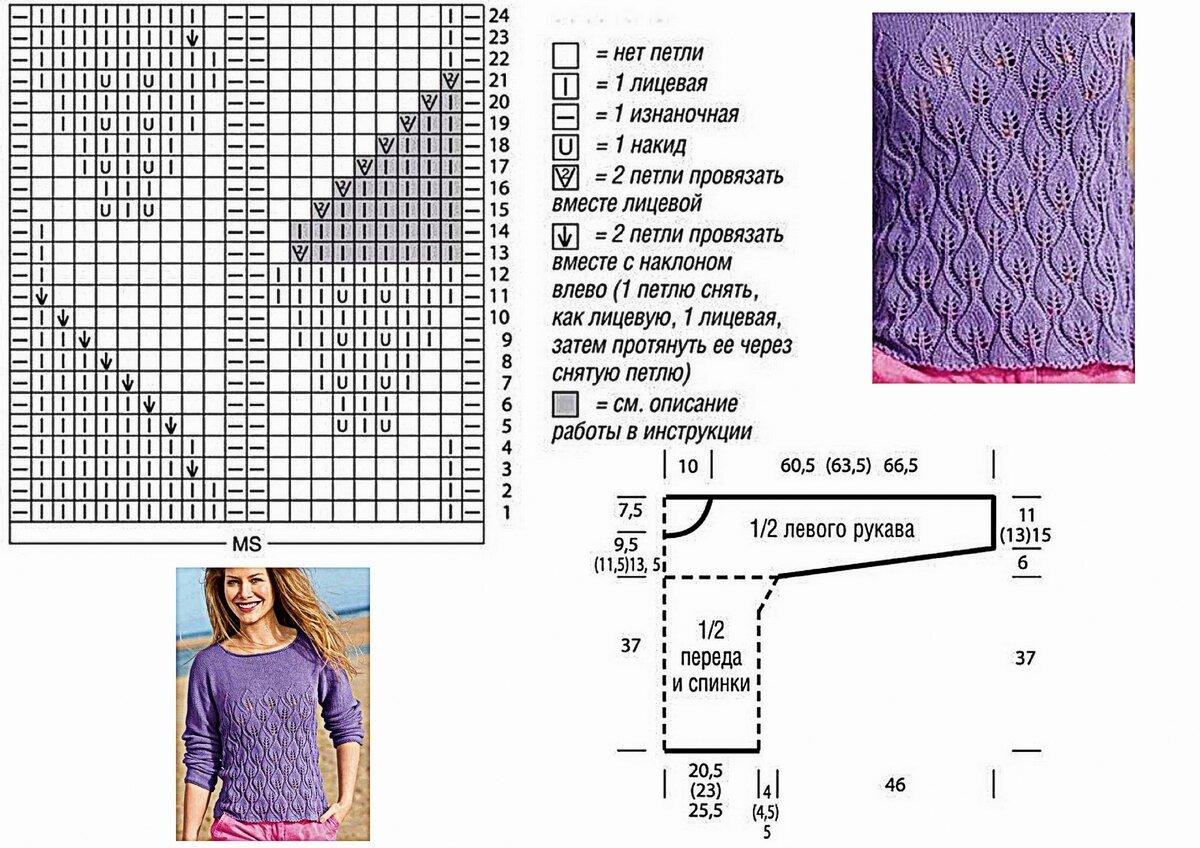 Симпатичный сиреневый джемпер с простым узором «листья» . Вяжется по кругу: связать можно как снизу вверх, начиная с ажурного узора и переходя к лицевой глади и рукавам; так и сверху вниз, начав с лицевой глади, оставив петли под рукава и продолжив ажуром, затем вернувшись к рукавам.