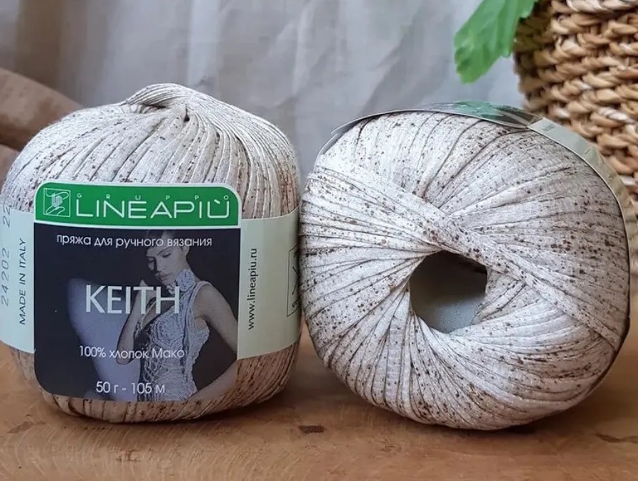 Для вязания нам потребуется 550 (600) г серебристо-серой ленточной пряжи Lineapiu Keith: 100% хлопок; 105 м/50 г.